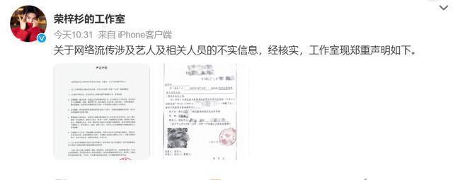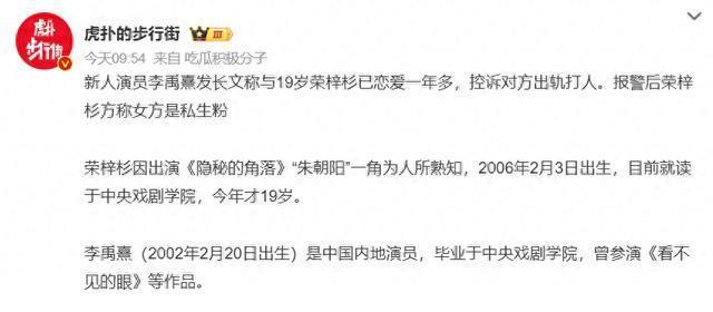 对此,他和他的工作室是怎么反应的呢? 荣梓杉方否认恋情,称女方是私生 10月16日的上午10点半,荣梓杉工作室发布了声明,表示荣梓杉从未和李禹熹建立过恋爱关系,更不存在出轨。