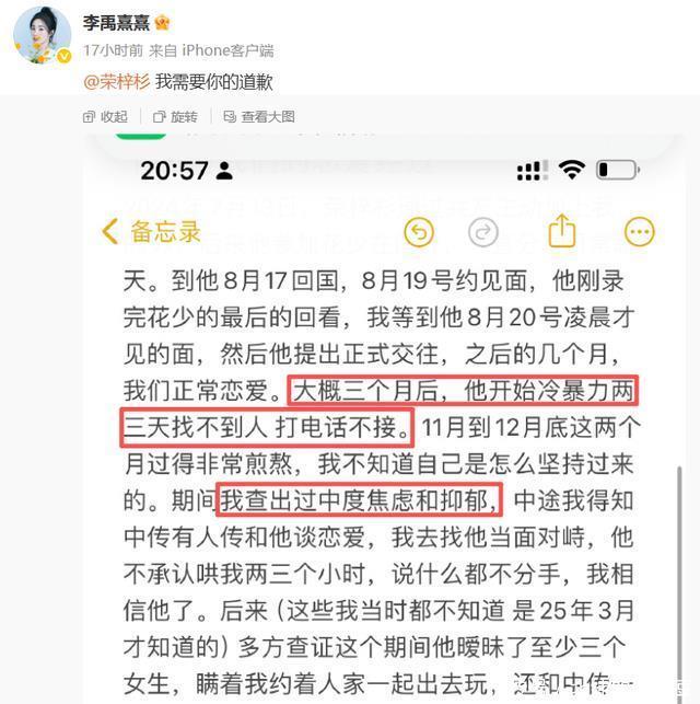 不少网友看到这表示,难怪在看节目的时候经常能看到荣梓杉在玩手机,根本就不离手。 荣梓杉参加完节目回国后,约李禹熹见面,两人不久后就开始正式交往。 但是这段恋爱并不甜蜜,李禹熹在文中提到,他们交往了大概三个月,荣梓杉就对她冷暴力,经常消息不回、人也找不到,让她心力交瘁。